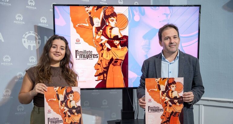 El delegado de Cultura en el Ayuntamiento de Mérida, Antonio Vélez, y la artista local Fuensanta Blanco han presentado este viernes el espectáculo 'Ramillete de mujeres', una actividad incluida en las celebraciones del Mes del Flamenco.